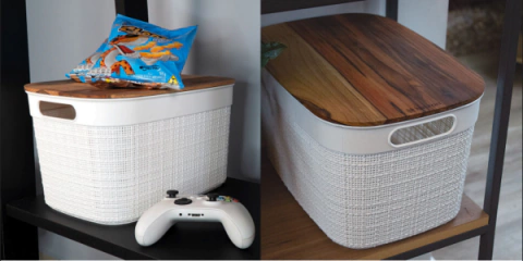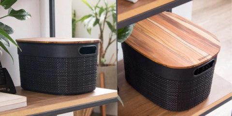 Su tapa de madera de teca le otorga un contraste refinado, que aporta luminosidad y frescura al ambiente. Perfecta para organizar en el hogar o en la oficina, esta caja no solo es práctica, sino también una pieza decorativa que se adapta a diferentes estilos de decoración, desde lo minimalista hasta lo bohemio.